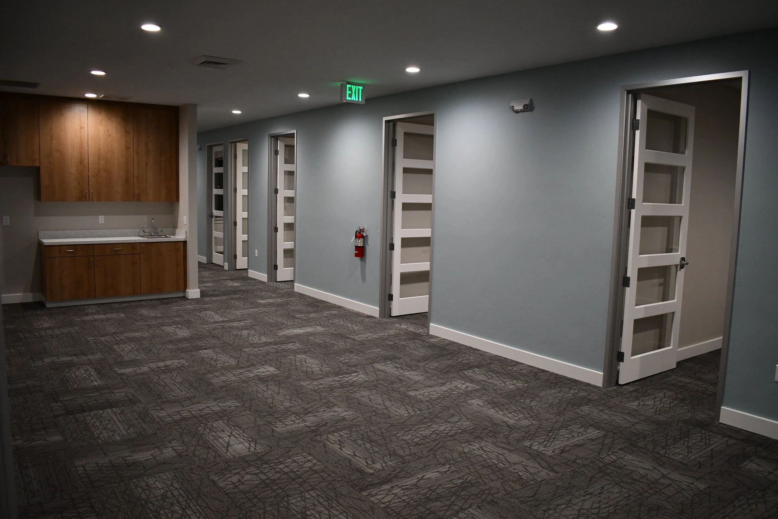 Custom, 8ft tall interior glass paneled doors on all offices to allow light into space